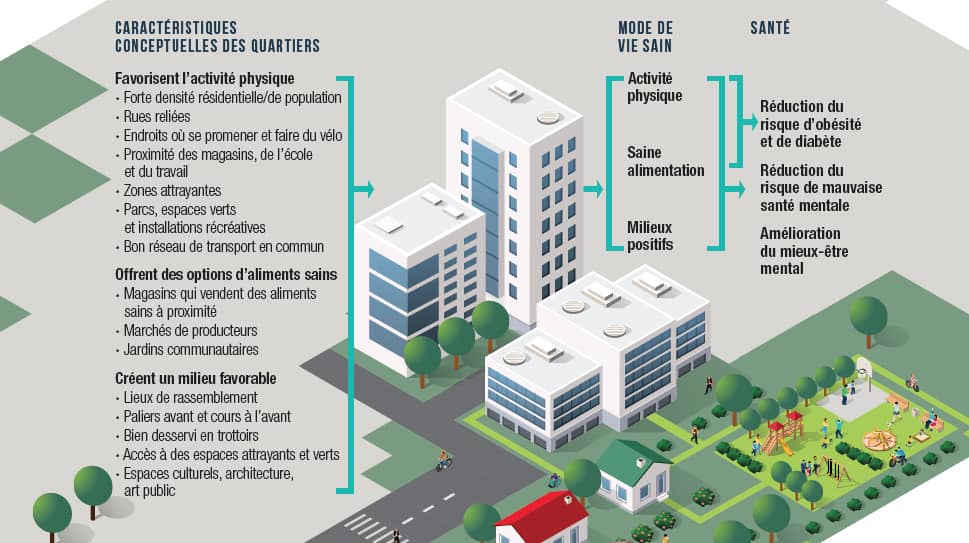 Après avoir réalisé une imposante revue de la littérature, l’administratrice en chef de la santé publique du Canada conclut que la modification du milieu bâti peut être un moyen rentable d’accroître l’activité physique. D’ailleurs, les preuves ne sont plus à faire. Les quartiers denses où l’on peut vivre, travailler, s’approvisionner et jouer à distance de marche sont synonymes de populations actives et en santé, aussi bien physique que mentale.