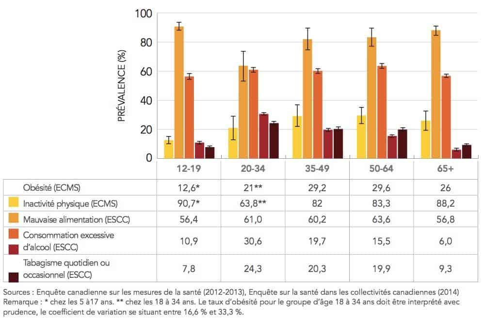 Au Canada, 4 adultes sur 5 présentent au moins un facteur de risque modifiable. Le tiers des individus en présentent au moins 2 et plus de 11 % sont à 3. Selon l’Organisation mondiale de la santé (OMS) il existe 4 facteurs de risque modifiables : tabagisme, inactivité physique, mauvaise alimentation et consommation abusive d’alcool. L’OMS a par ailleurs identifié 2 conditions à risque : l’obésité et l’hypertension.