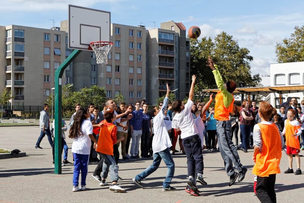 Heure du midi dans la cour du collège Gabriel-Rosset à Lyon : les Green Anonymous affrontent les Dark Angels au cours d’un match de basket endiablé. L’arbitre tempère les ardeurs des joueurs et joueuses, des journalistes sont à l’œuvre et des partisans s’époumonent. Tout ce beau monde a entre 11 et 15 ans et l’affaire est sérieuse : le tournoi « Challenge Gabriel-Rosset » se déploie sur toute l’année et les 600 élèves du collège y participent d’une façon ou d’une autre, 2 fois par semaine.