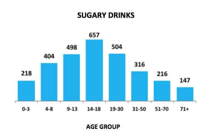 Autre chiffre inquiétant : ce sont les adolescents de 14 à 18 ans qui avalent quotidiennement le plus de boissons sucrées, soit 657 ml par jour, ce qui équivaut à 296 calories (16 cuillerées à thé de sucre)!