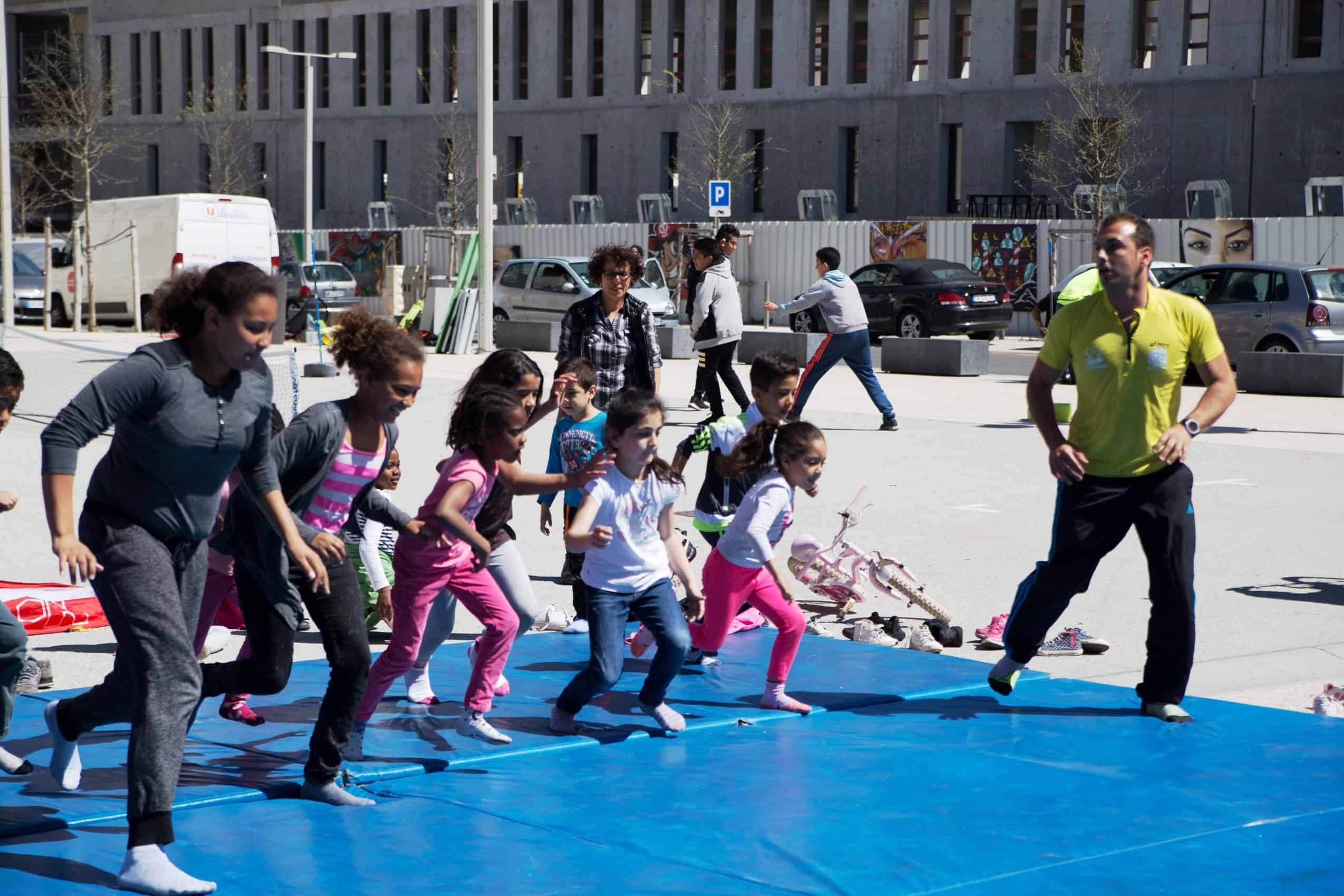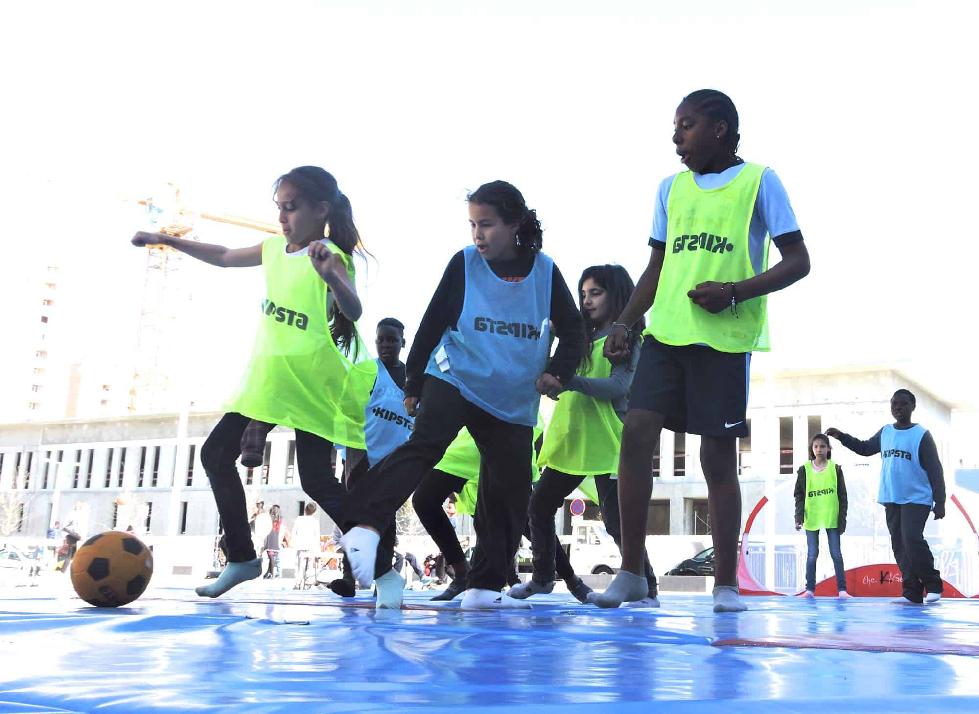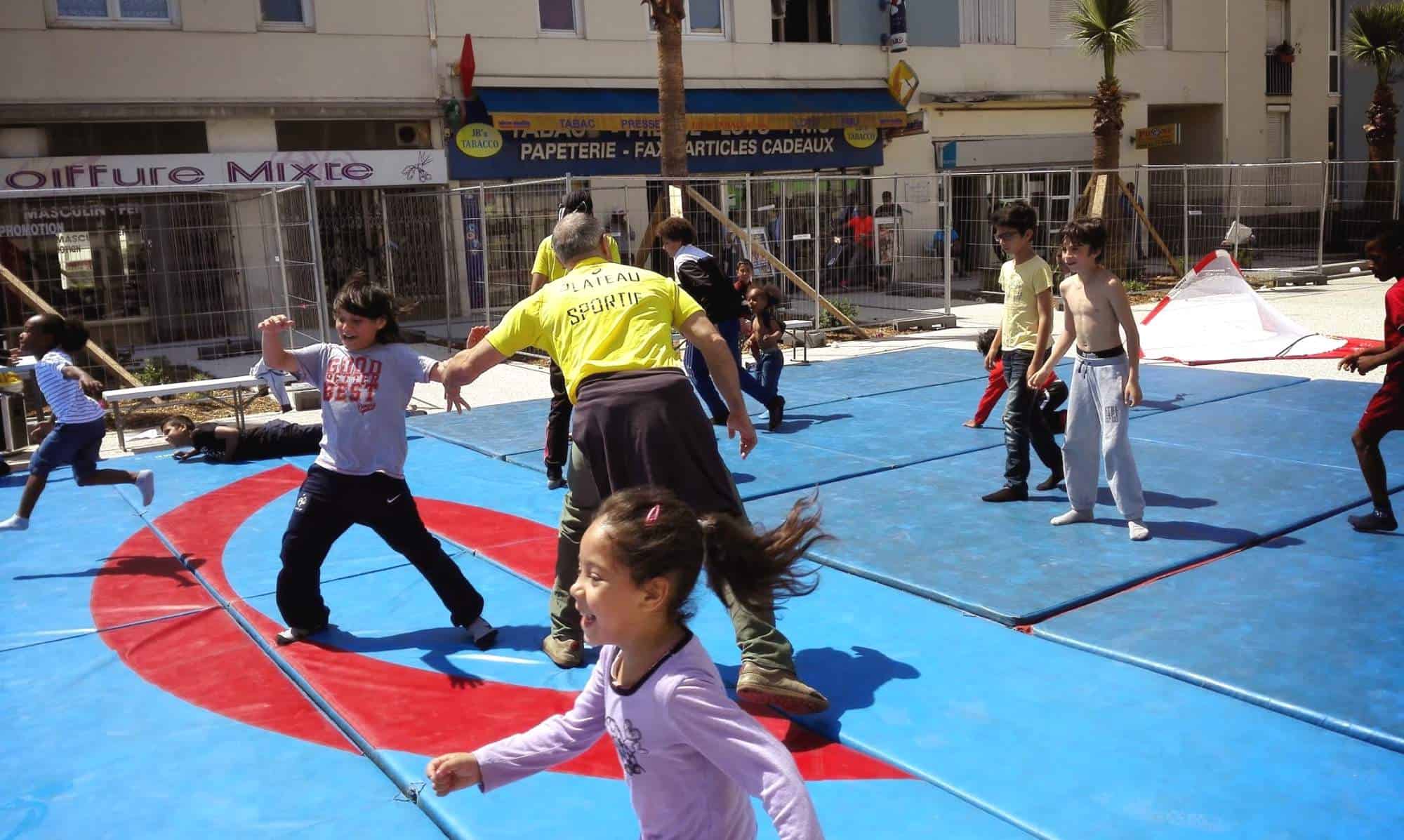 Ils ont entre 6 et 16 ans et ils jouent au foot en pieds de bas sur des tapis bleus installés dans leur quartier, à Nice. Tennis-ballon, danse hip-hop, jeux d’opposition, karaoké, il y en a pour tous et toutes et ils en redemandent. Ce plateau sportif mobile, polyvalent et gratuit, c’est l’idée de Jean-Michel Deya, fondateur de l’association Prévention Éducation Sport.
