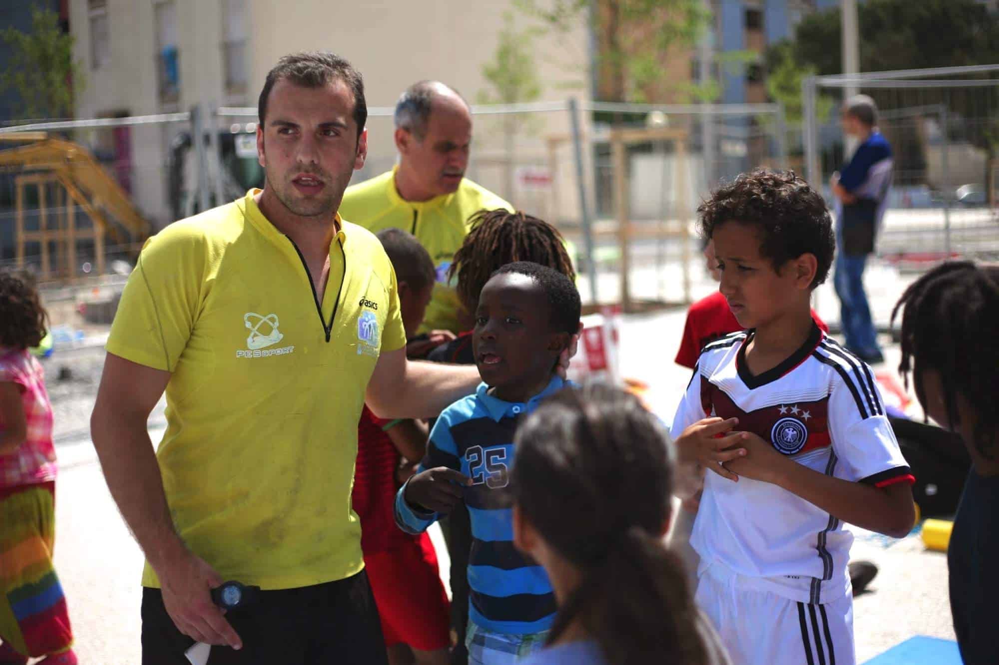des jeunes avec qui il joue au foot en pieds de bas.