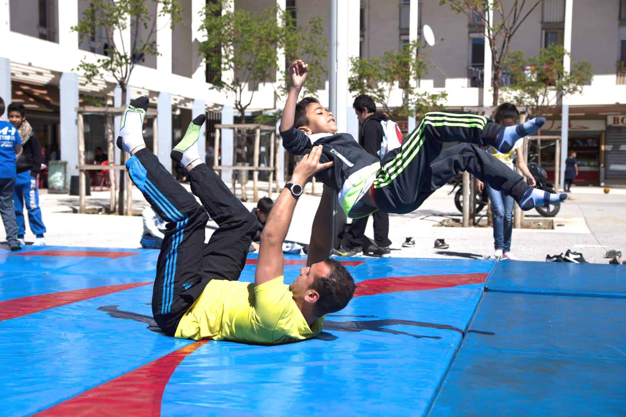 Je travaille avec deux éducateurs sportifs diplômés, deux éducateurs spécialisés et de jeunes bénévoles. Nous installons les tapis bleus, sortons le matériel et proposons différentes activités comme les jeux d’opposition (une variante de la lutte), le basket, le tennis-ballon, le foot (soccer), le hip-hop, etc. Nous sommes là pendant les vacances scolaires de 14 h à 17 h et de 17 h à 20 h l’été.