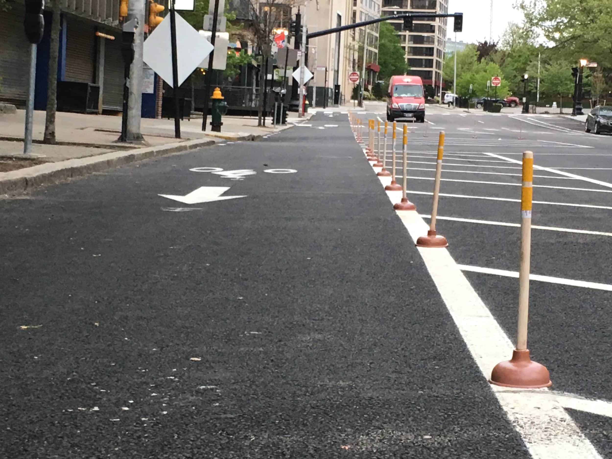 Cette fois, c’est à Providence, au Rhodes Island que les débouchoirs-délinéateurs viennent de faire leur apparition. Et le maire de la Ville ne semble pas les voir d’un mauvais œil. Il a même déclaré qu’ils ne seraient pas retirés de la chaussée, à moins qu’on ne fasse la preuve qu’ils nuisent à la fluidité du trafic. Par ailleurs, la Ville s’est engagée à trouver de meilleures solutions, durant l’été, afin de mieux délimiter la voie cyclable en utilisant soit des bacs à fleurs soit des délinéateurs plus standards.