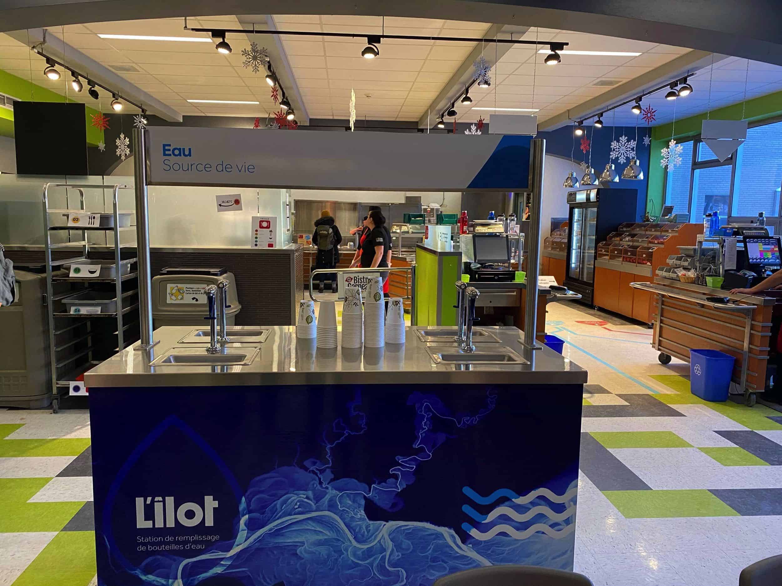 En décembre dernier, le cégep Garneau mettait fin à la vente de bouteilles d’eau sur l’ensemble de son campus. Cela marquait en quelque sorte le coup d’envoi de l’opération EAU dont l’objectif n’est pas seulement d’éliminer les bouteilles de plastique à usage unique, mais aussi de faire la promotion de l’eau du robinet. Une première station de distribution d’eau, appelée l’Îlot, a donc été installée dans l’une des trois cafétérias du campus et les fontaines d’eau qui ne sont pas encore adaptées au remplissage de bouteilles réutilisables seront graduellement mises aux normes dans tous les pavillons. À terme, le cégep vise l’élimination de tous les contenants de plastique à usage unique, et donc les boissons sucrées ainsi que les jus, car l’eau du robinet demeure le choix santé par excellence.