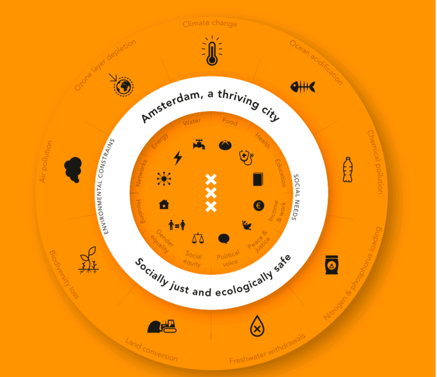 L’objectif peut paraître ambitieux, mais la Ville vise, à l’horizon de 2050, l’atteinte d’une économie complètement circulaire basée sur la réutilisation des matières premières pour éviter le gaspillage et réduire les émissions de CO2. Une stratégie qui en ferait la première ville au monde à adopter le modèle économique de City Doughnut. Développé par l’économiste Kate Raworth, de l’Institut de changement environnemental de l’Université d’Oxford, ce modèle de beignet économique consiste à faire coïncider les besoins de base d’une bonne vie citoyenne : revenu; travail; santé; réseaux sociaux; participation politique avec les limites écologiques de la planète. Toutefois, la Ville demeure consciente de l’ampleur des défis à relever. Dans son plan d’action 2020-2025, elle ne cache pas que ces nouvelles manières de faire vont inévitablement engendrer des frictions. D’autant plus que, bien souvent, les bénéfices de ces mesures ne seront pas visibles à court terme : parfois seulement après quelques décennies ou alors à l’autre bout de la planète. Malgré tout, Amsterdam a décidé d’investir dans le futur.