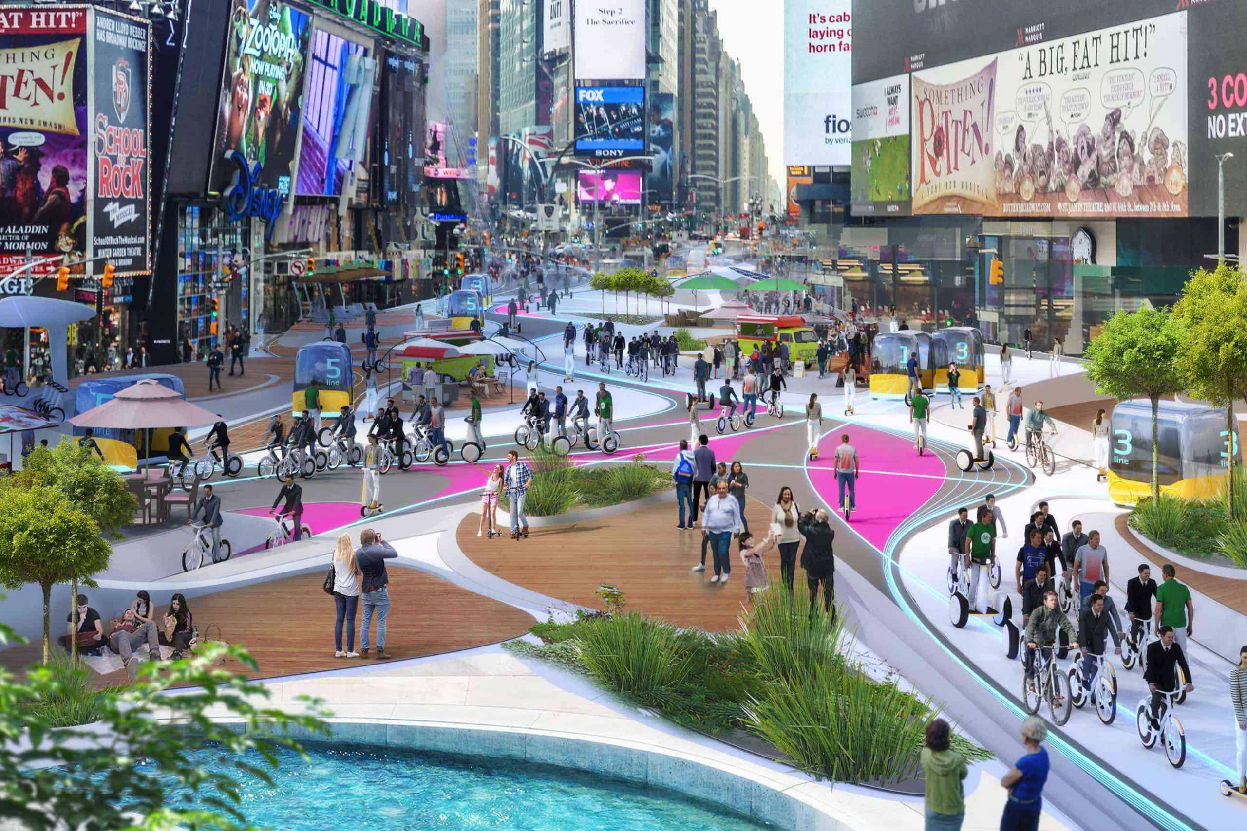 Ce genre d’exercice de prospective est plus facile à réaliser que jamais avec la puissance des logiciels qui génèrent des images par ordinateur. Une firme allemande d’architectes, 3deluxe, s’est prêtée à l’exercice pour réinventer le fameux Time Square de New York. Bien qu’il ne s’agisse pas d’une commande, la firme précise que c’est une étude de cas, car il ne fait pas de doute que les automobiles vont graduellement disparaître de l’environnement urbain. D’ailleurs, la COVID-19 a conduit de nombreuses villes à redistribuer la chaussée pour accorder plus d’espace aux piétons et aux cyclistes. Des changements qui dans bien des cas vont demeurer permanents. À terme, prône 3deluxe, les trottoirs et les rues, tel que nous les connaissons, vont complètement disparaître. D’où la nécessité de repenser les « surfaces » qui séparent les édifices afin de les aménager non plus en fonction des voitures, mais des humains.