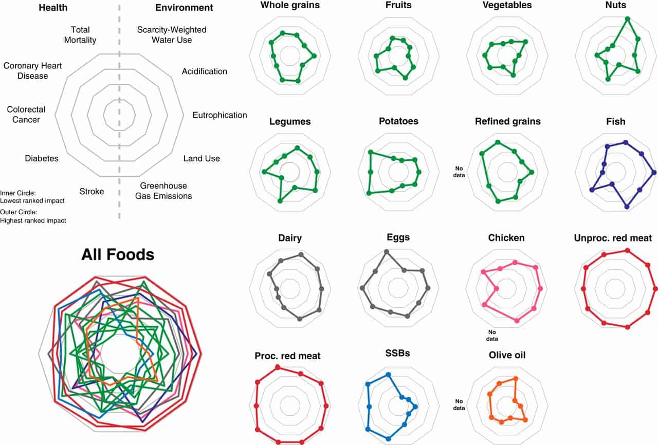 La figure ci-dessus illustre de façon précise comment chaque groupe d’aliments se situe par rapport aux dix points retenus par les chercheurs. Il met en évidence le fait que les aliments associés à une meilleure santé ont aussi, à l’exception du poisson, la plus faible empreinte environnementale. Inversement, ce schéma indique clairement que la consommation de viande rouge (transformée ou pas) est associée à des effets néfastes sur la santé humaine et à une lourde empreinte environnementale.