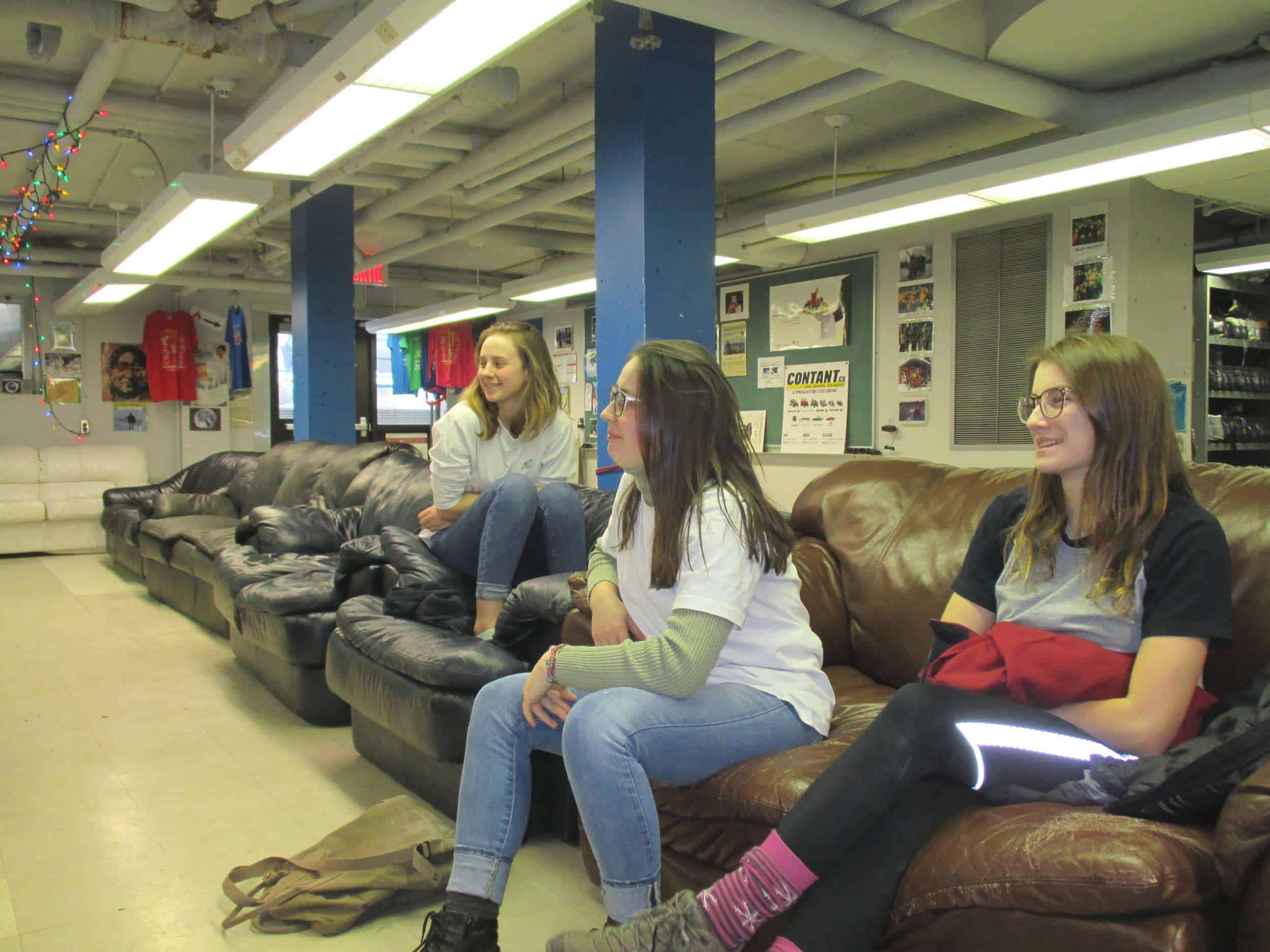 Marie-Pier, Paule et Laurence dans le local d'éducation physique« Les filles qui embarquent dans l’expérience du Shack sont particulièrement courageuses, parce que physiologiquement, une femme résiste moins bien au froid qu’un homme. » Éric Laforest