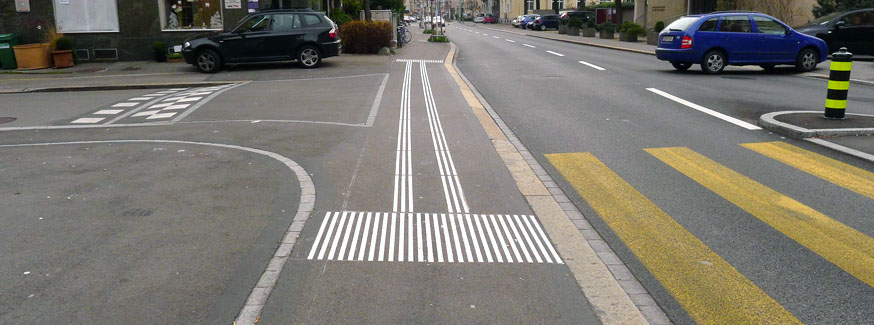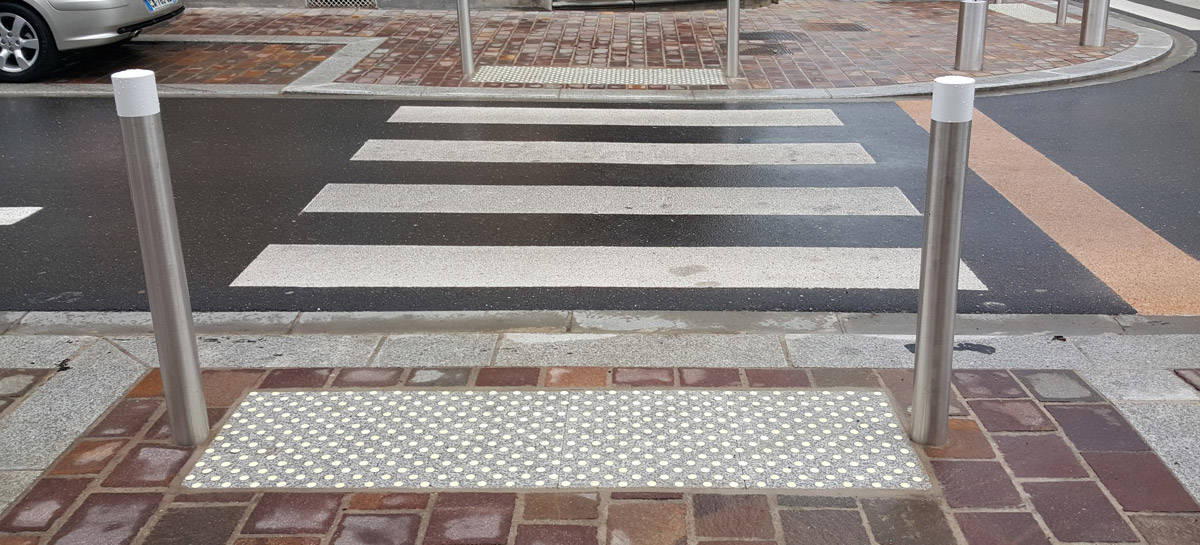 Les surfaces podotactiles, de leur côté, vont faciliter la navigation des personnes aux prises avec des limitations visuelles. Sorte de signalisation Braille placée sur le sol, ils servent de repère pour indiquer le début ou la fin d’un trottoir, pour annoncer la présence d’un bateau pavé, etc.