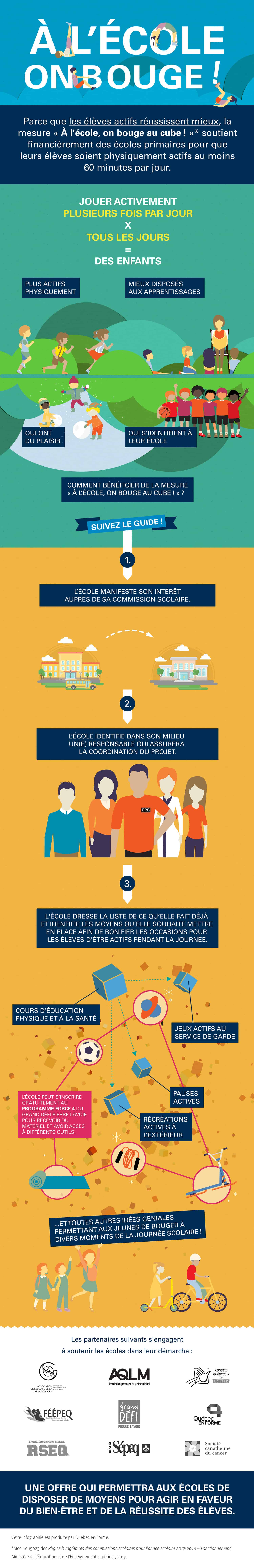 De nombreux milieux scolaires offrent déjà aux jeunes des occasions amusantes et innovantes de bouger à chaque jour. La mesure « À l’école, on bouge au cube! » offre un soutien financier aux écoles pour aller encore plus loin. L’idée : appuyer les équipes-écoles pour que les élèves soient actifs au moins 60 minutes par jour. Les subventions allouées seront un véritable levier pour que le changement de pratiques se poursuive à long terme.