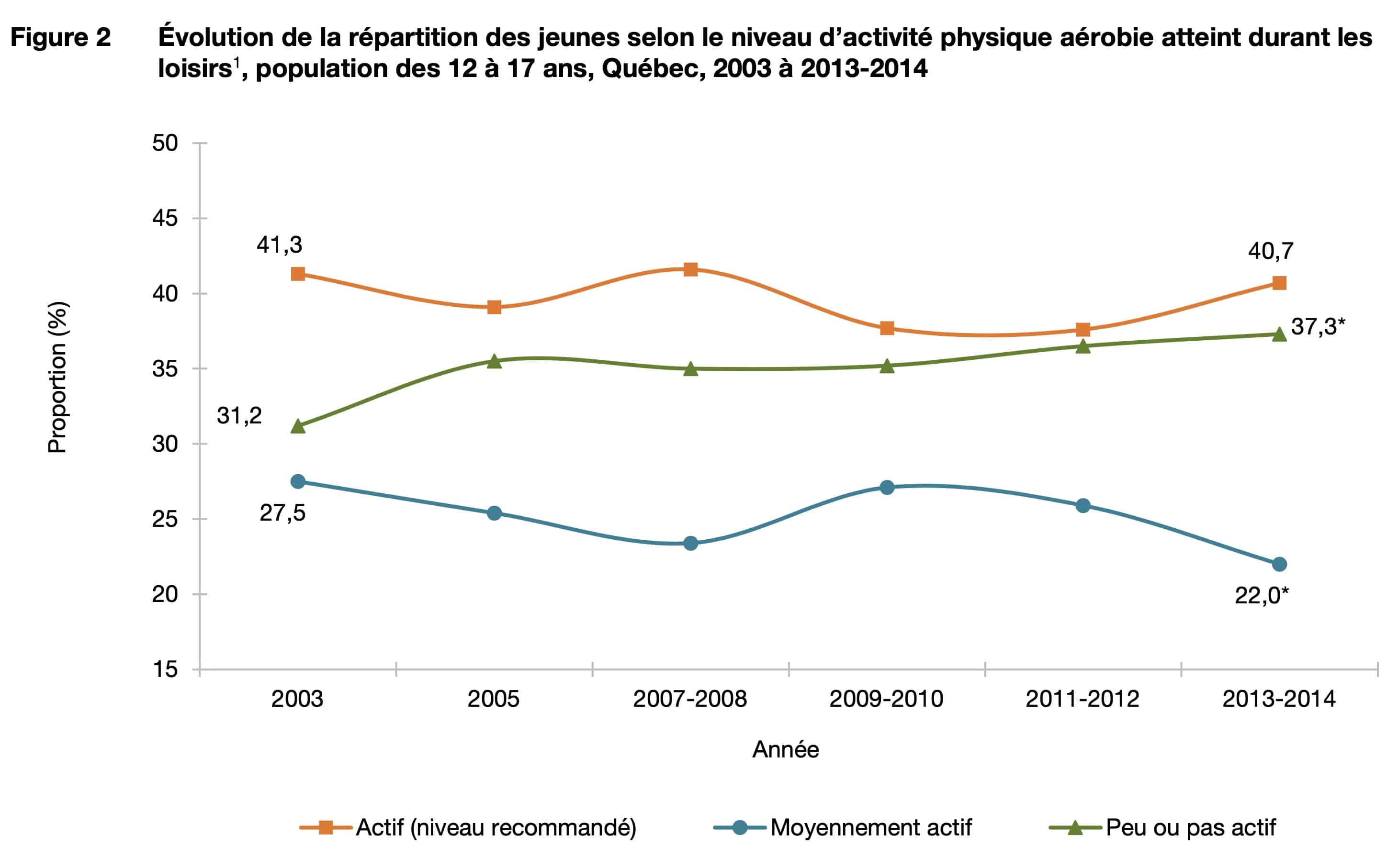 Lorsque l’on compare les niveaux d’activité physique sur la période de 2003 et 2013-2014, on constate que la proportion d’actifs chez les 12-17 ans est demeurée stable. Par contre la proportion des « moyennement actifs » a diminué, pour passer de 28 % à 22 %. Et donc, celle des « peu ou pas actifs » a augmenté, pour passer de 31 % à 37 %.