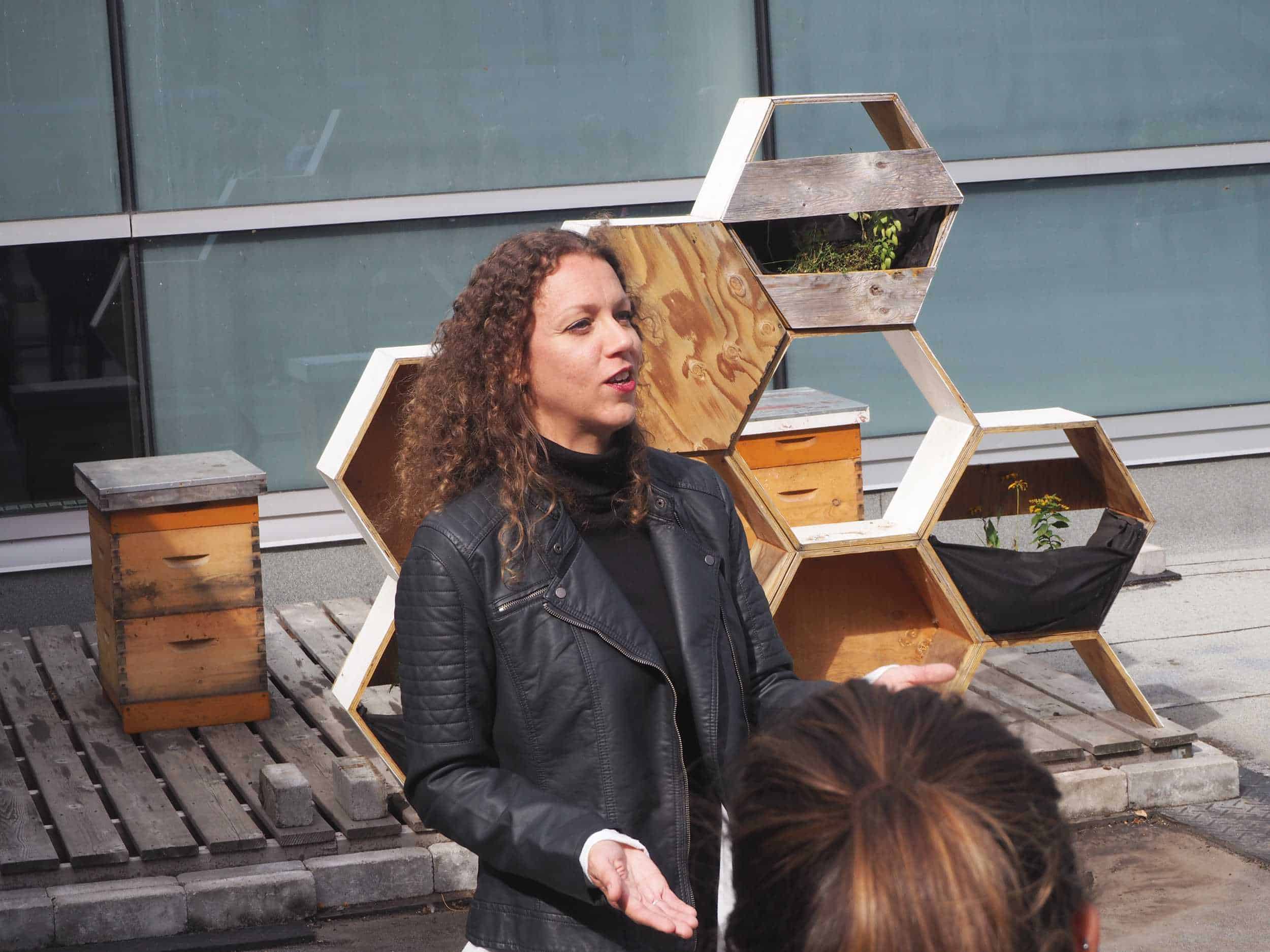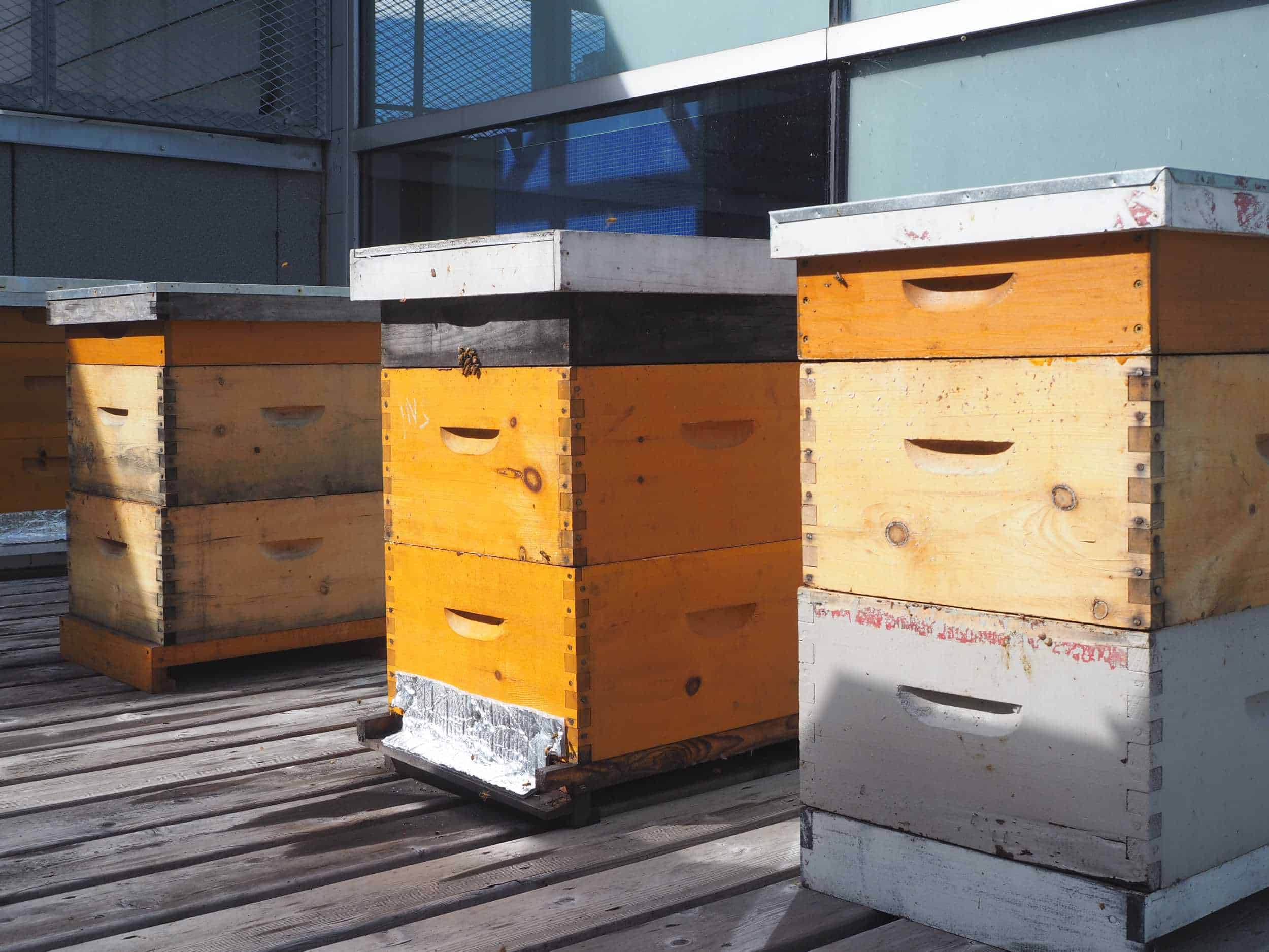 Qui dit agriculture, même urbaine, dit aussi pollinisation. C’est pourquoi trois ruches d’abeilles domestiques sont installées sur le toit, à proximité des jardins potagers. Non seulement permettent-elles d’optimiser la production maraîchère, mais elles donnent de 60 à 80 kg de miel par année.