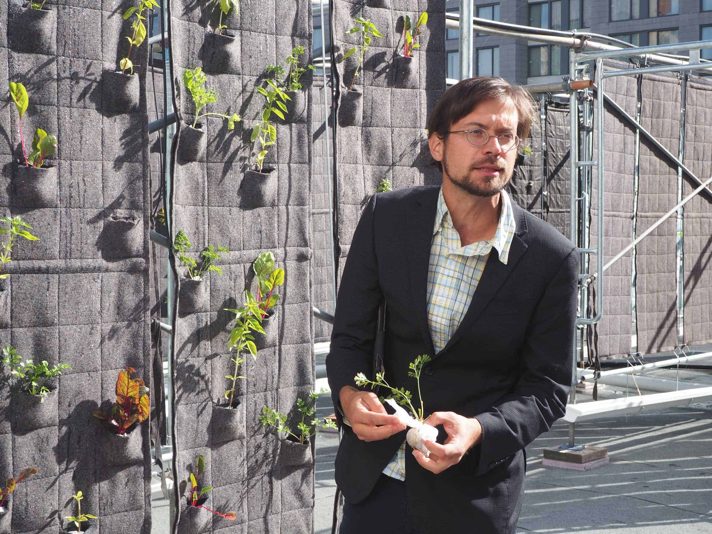 « Un des avantages de cette méthode, explique Jean-Philippe Vermette, chercheur et cofondateur de AU/LAB, c’est que l’on peut doubler, voire tripler la surface cultivable. Avec 1 pi2 d’occupation au sol, on obtient à la verticale l’équivalent de presque 3 pi2. Sur le plan économique, notre système coûte 10 $ le pi2 au lieu de 25$. »