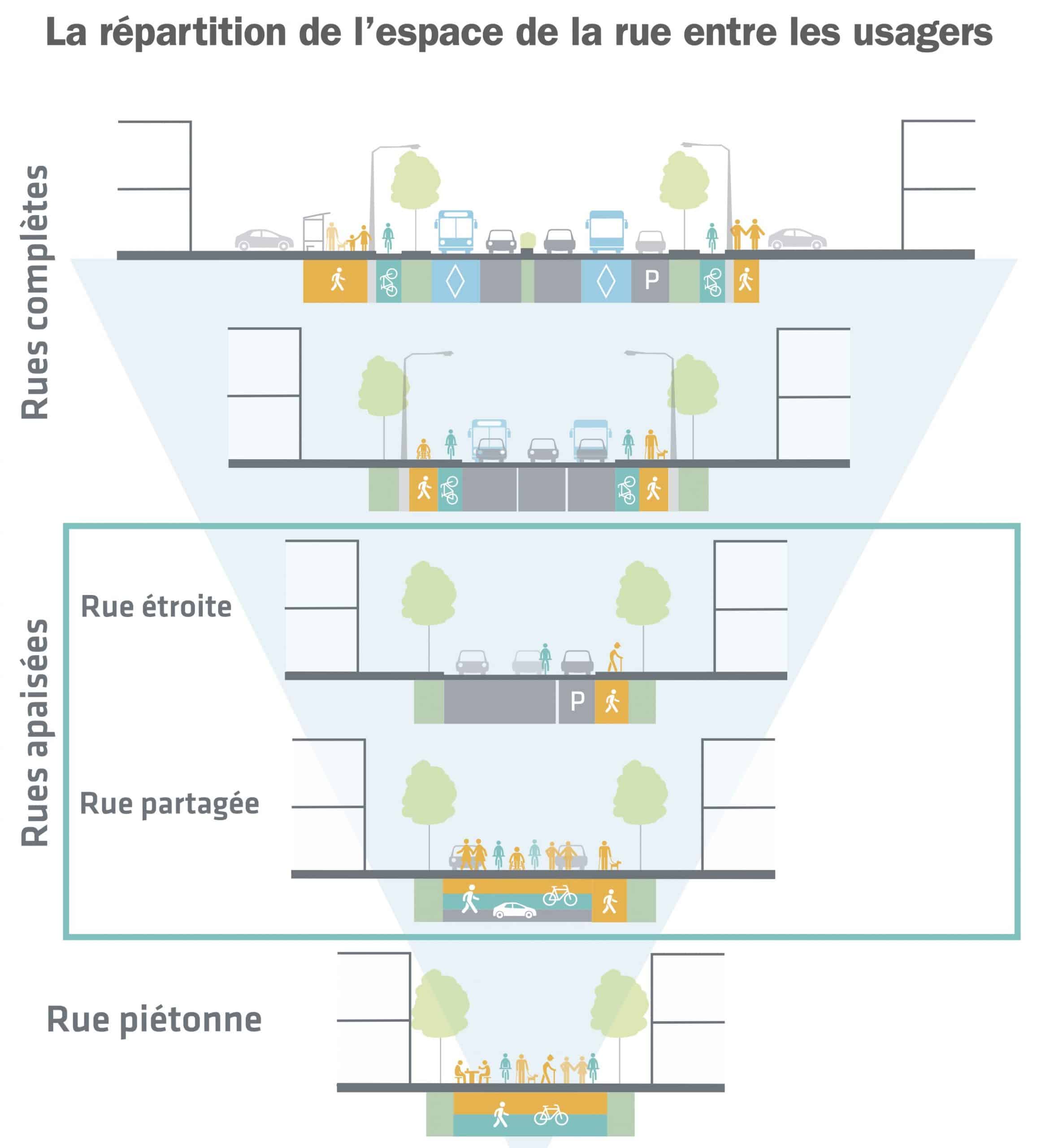Le principe à la base de ce guide, précise Christian Savard, c’est que la chaussée ne serve plus exclusivement aux voitures, mais à tout autre chose, comme jouer, se déplacer à pied ou à vélo ou même la traverser là où on souhaite, et pas seulement aux intersections.