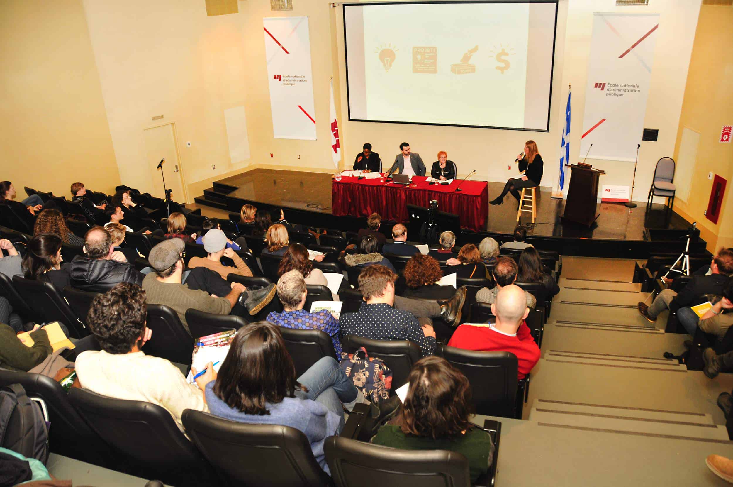 La rencontre était animée par Véronique Fournier, directrice du CEUM. D’entrée de jeu, celle-ci s’est réjouie de pouvoir réunir à une même table, et ce, pour la première fois au Québec, des élus afin qu’ils parlent de leurs expériences en matière de budget participatif (BP). Un mouvement en émergence, a-t-elle souligné, et qui est en voie de transformer nos pratiques d’administration publique. Ce qui n’est pas étranger au fait que l’événement se tenait à l’École nationale d’administration publique, dont l’auditorium était gracieusement mis à la disposition du public.
