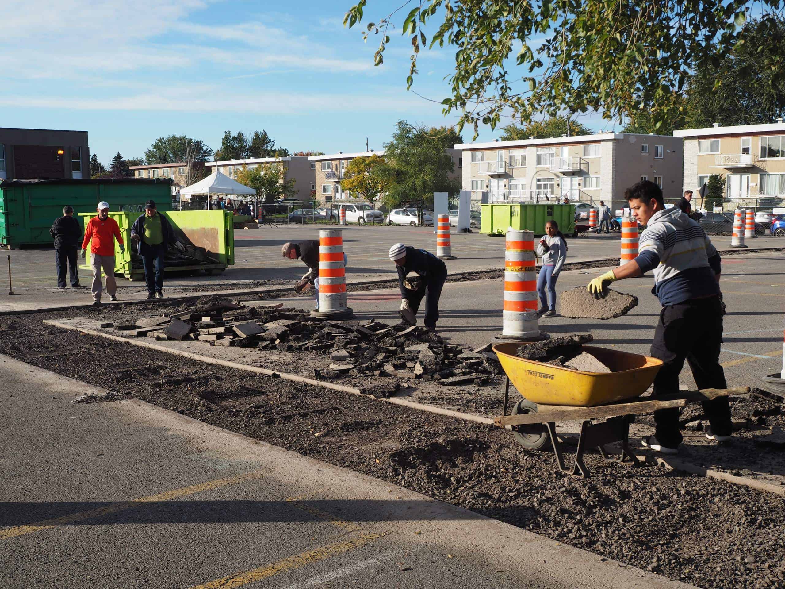 Par une splendide matinée d’automne, une cinquantaine de parents et d’enfants se sont donné rendez-vous pour participer à une joyeuse corvée de désasphaltage dans la cour de l’école Lionel-Groulx de Longueuil. À cette occasion, le Centre d’écologie urbaine de Montréal (CEUM) en a profité pour lancer, dans le cadre du projet Sous les pavés, son nouveau guide De l’asphalte vers un milieu de vie.