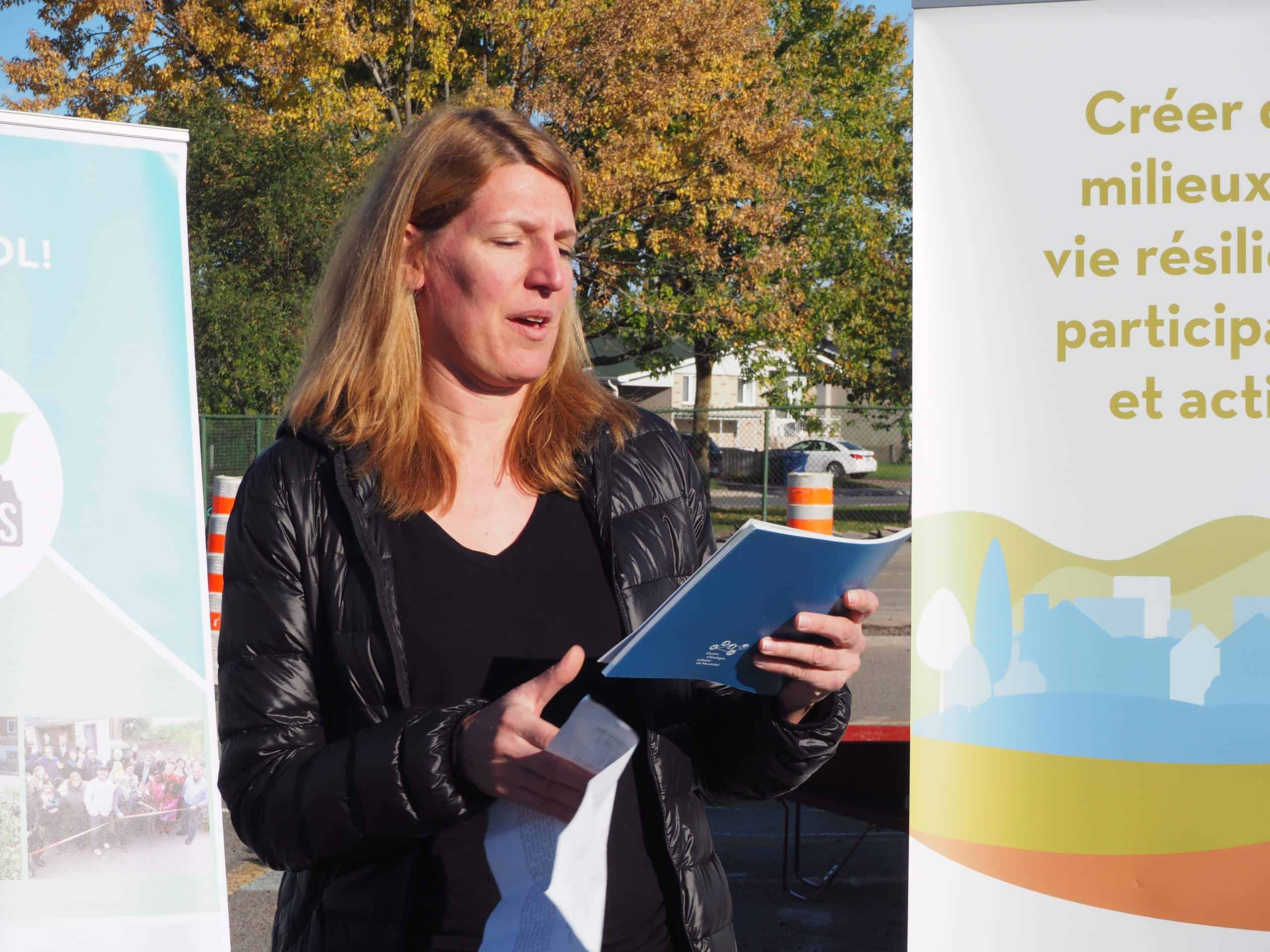 C’est dans ce contexte idéal que Véronique Fournier, directrice générale du Centre d’écologie urbaine de Montréal, prenait la parole pour décrire le tout nouveau Guide pour la réalisation d’un projet de dépavage participatif. « Un guide qui se fonde sur l’expérience acquise à la suite d’une douzaine de projets de déminéralisation à travers le Québec, que ce soit dans les cours d’école, ou dans un stationnement de centre communautaire, et même le stationnement d’une entreprise qui en a converti une partie pour aménager un jardin communautaire. »