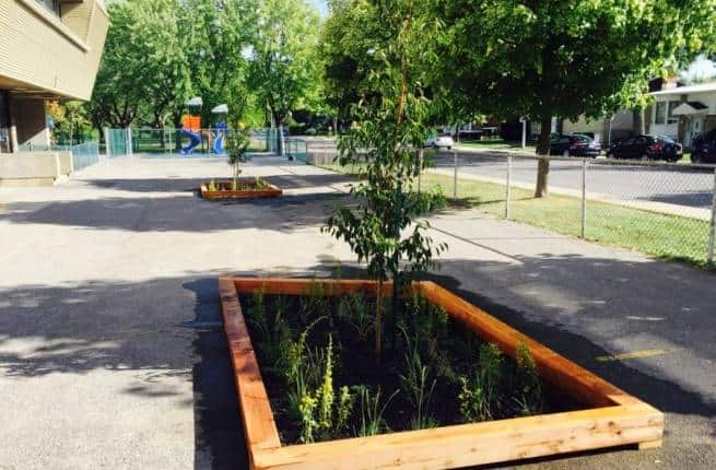 - Le Conseil régional de l’environnement de Montréal coordonne le projet ILEAU (Interventions locales en environnement et aménagement urbain) dans l’est de Montréal. Ce projet inclut le verdissement de plusieurs écoles et garderies, par exemple : École Gabrielle Roy, École La Dauversière, CPE Aux petits soins.