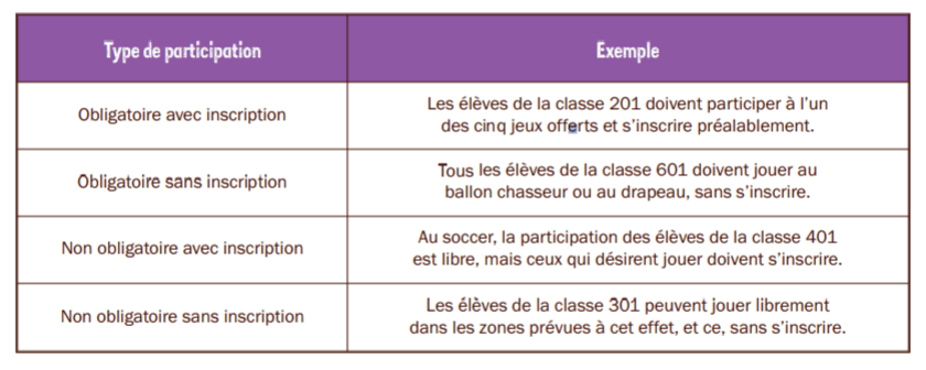 Type de participation. Les élèves peuvent être amenés de plusieurs façons à prendre part à un jeu. Leur participation peut être obligatoire ou non, avec ou sans inscription, tel que montré ci-dessous.