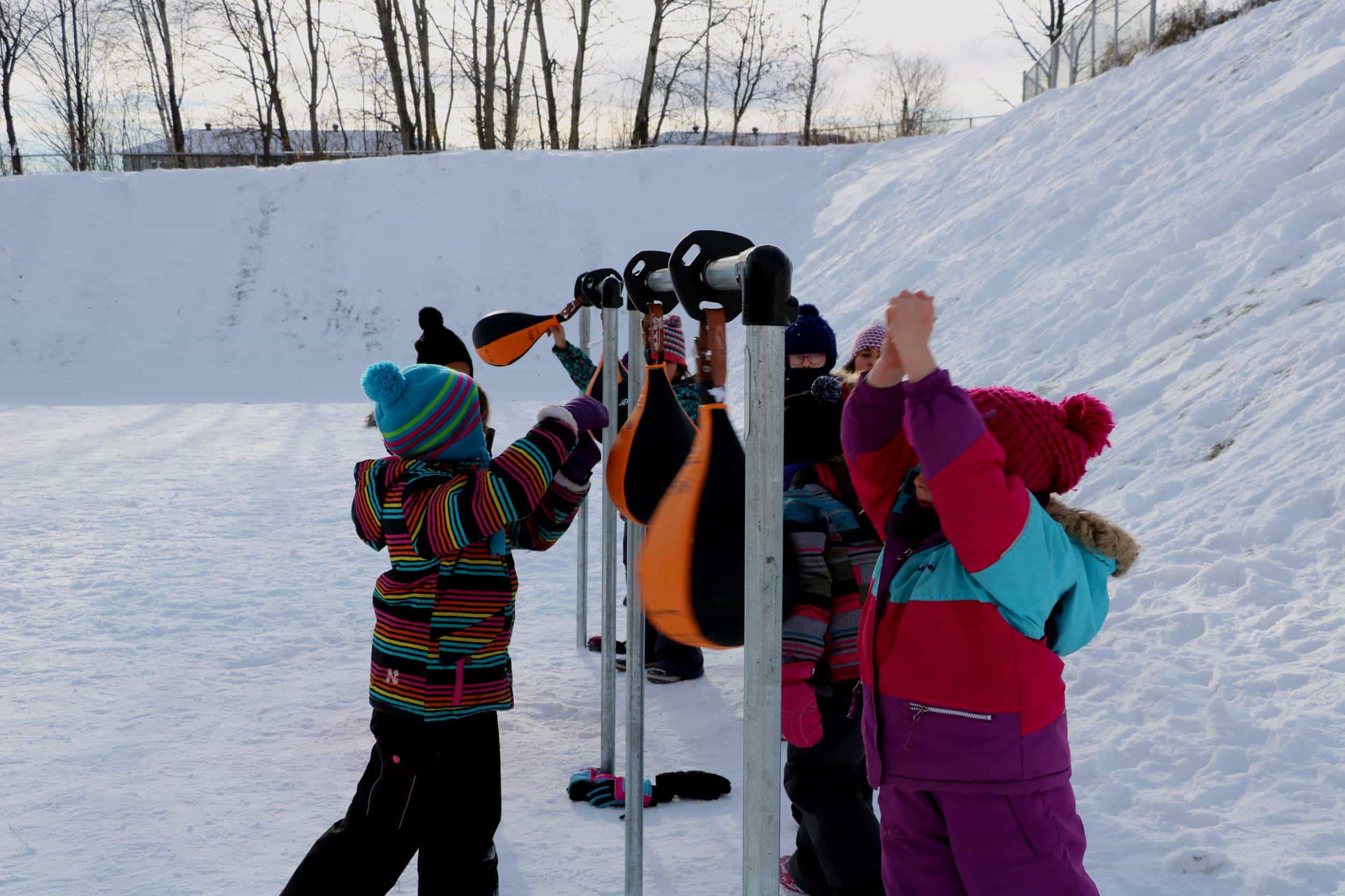 Les recherches sont unanimes : le simple fait de rendre disponible du matériel varié et en quantité suffisante contribue significativement à faire bouger les jeunes, et ce, peu importe le moment de l’année. D’ailleurs, la majorité du matériel utilisé lors des autres saisons (ballon, ballon-poire, accessoires de cirque, petites voitures, tapis de sol, etc.) peut également être utilisé en hiver. Certains intervenants innovent même en utilisant différemment le matériel, par exemple en se servant de ces seaux qui servent d’échasses pour les enfants et les utiliser dans la neige.