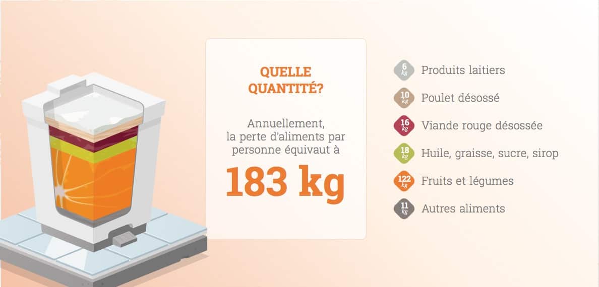 - Chaque personne gaspille en moyenne 183 kg d’aliments par année