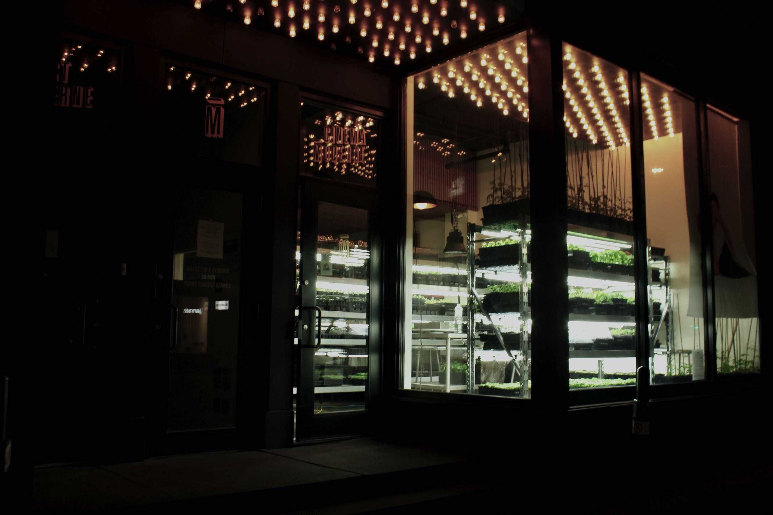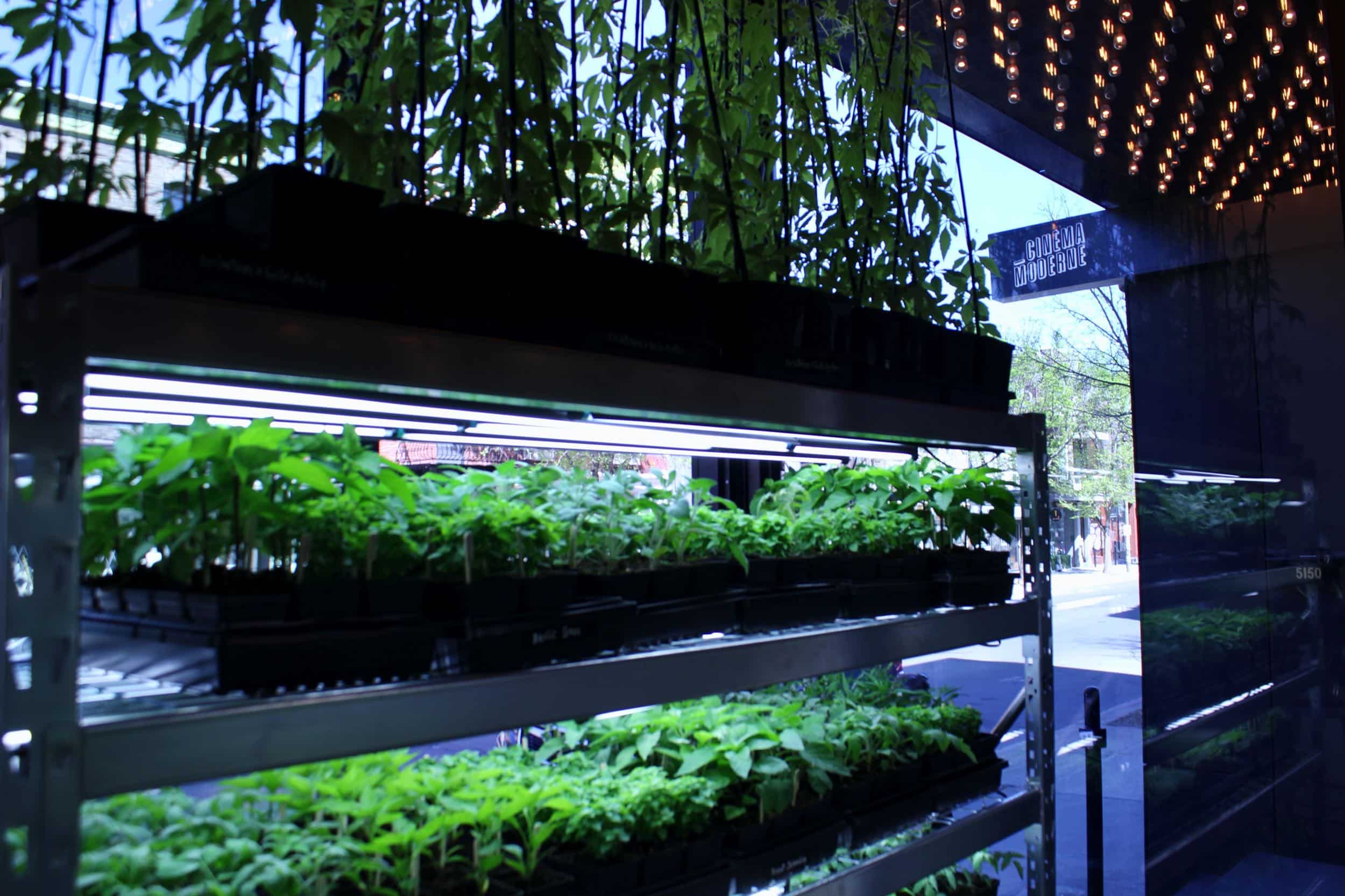 Début mai, l’artiste montréalaise Nancy Guilmette investissait l’espace vacant du Cinéma Moderne, fermé en raison du confinement, pour y installer, devant la grande vitrine, étagères et néons. Son projet : produire d’ici la fin du mois 2 000 plants de légumes au vert resplendissant !