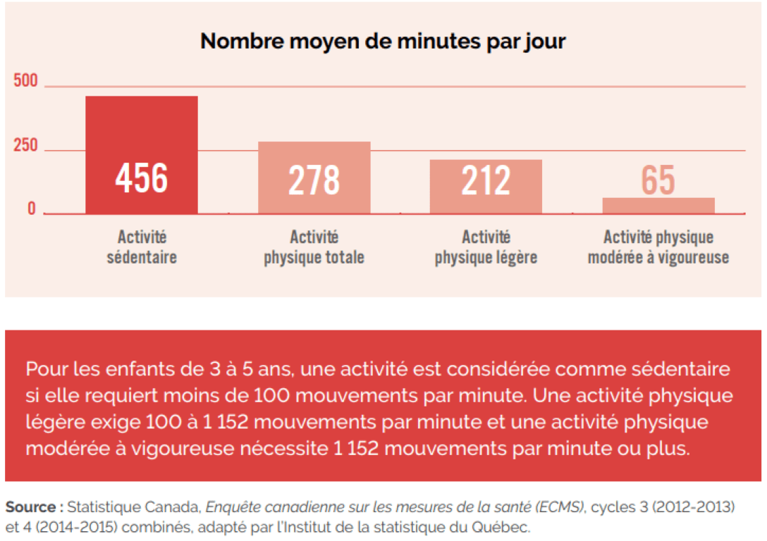Le portrait de la santé des jeunes enfants publié en 2017 par l’Observatoire des tout-petits rapporte lui aussi des données préoccupantes : selon des données collectées entre 2012 et 2015, les tout-petits de 36 à 60 mois consacraient en moyenne beaucoup plus de temps à des activités sédentaires qu’à de l’activité physique et, en 2015, le tiers d’entre eux étaient à risque de surpoids, en surpoids ou obèses.