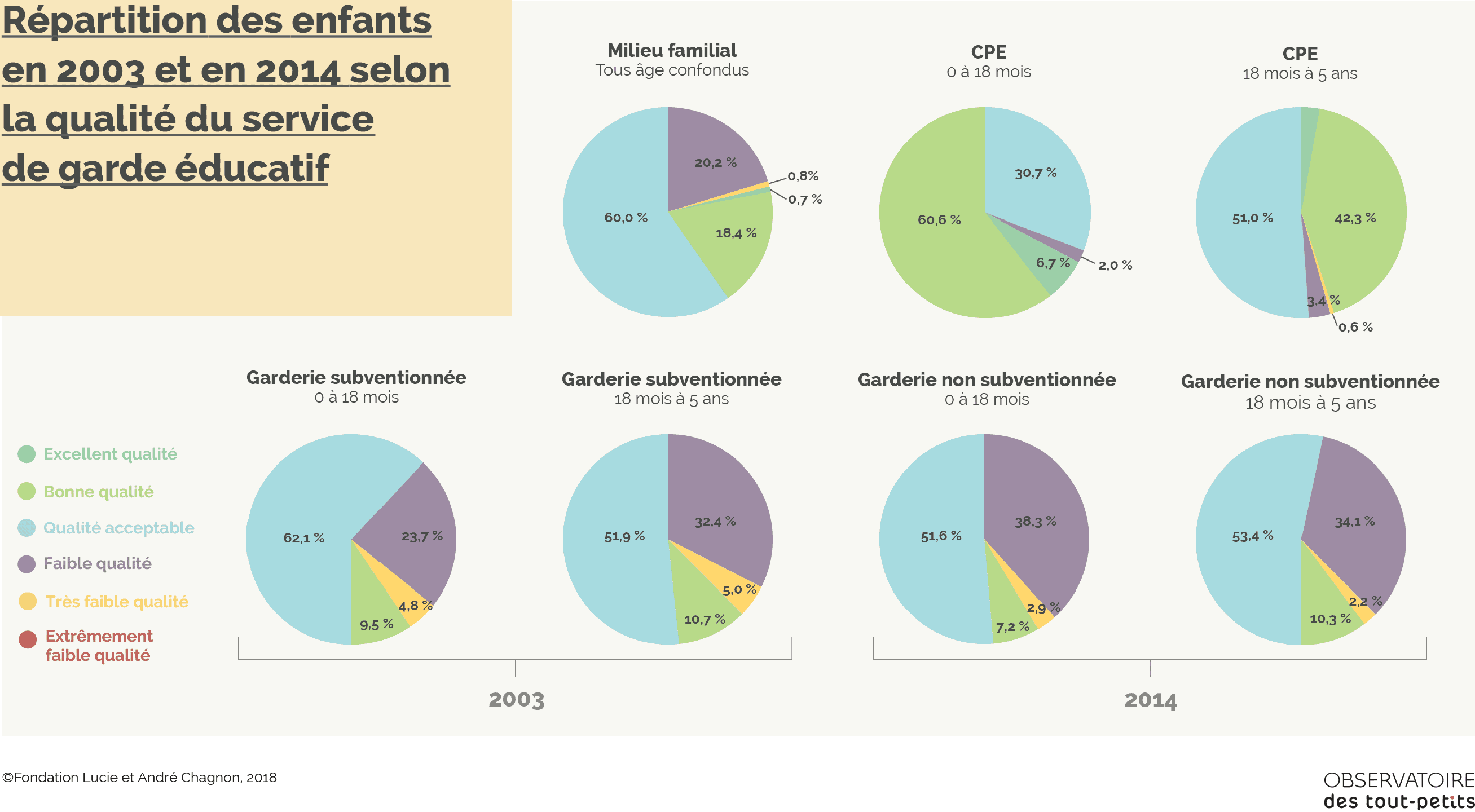 Comme le montre le graphique ci-dessous, tant en 2003 qu’en 2014, une proportion importante d’enfants québécois fréquentait des services éducatifs de faible (couleur lilas) ou très faible qualité (jaune). On peut toutefois remarquer que cette proportion est nettement moins élevée dans le cas des CPE.