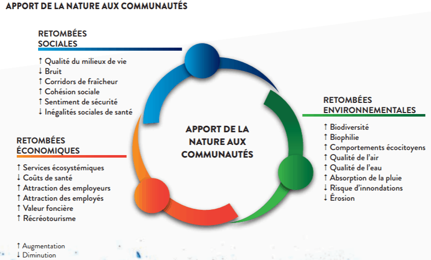 Les bienfaits de la nature, principalement en milieu urbain, sont présentés sous les trois piliers du développement durable : social, environnemental et économique.