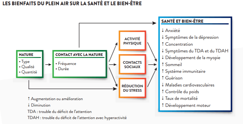 Outre la santé mentale et physique, les espaces où l’on fait du plein air ont des effets reconnus sur la qualité de vie des citoyens. La réduction des îlots de chaleur, la préservation de la biodiversité, la baisse du taux de criminalité et l’augmentation des retombées du récréotourisme font partie des avantages dont bénéficient les communautés.