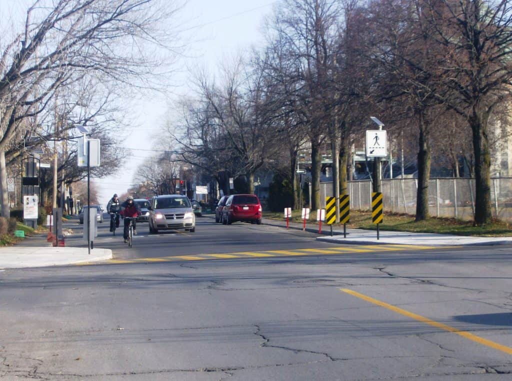 L’implantation d’avancées de trottoir permet de mettre en valeur la présence d’un passage pour piétons aux abords d’une école primaire, d’une piscine publique et d’une bibliothèque municipale, avenue Bellechasse. Arrondissement de Rosemont — La Petite-Patrie.Crédit photo: CEUM
