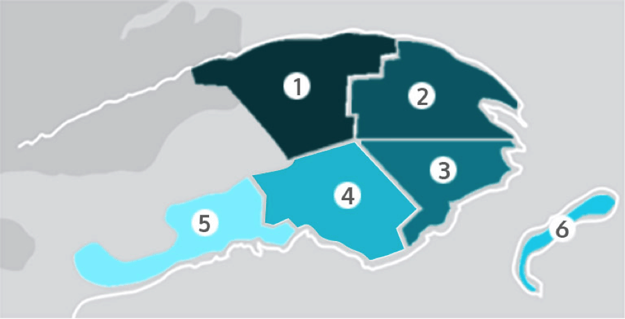 Municipalités régionales de comtés (MRC) de la Gaspésie-Les-Îles-de-la-Madeleine : 1) Haute-Gaspésie 2) Côte-de-Gaspé 3) Rocher-Percé 4) Bonaventure 5) Avignon 6) Îles-de-la-MadeleineSource photo : Vivreengaspesie.com