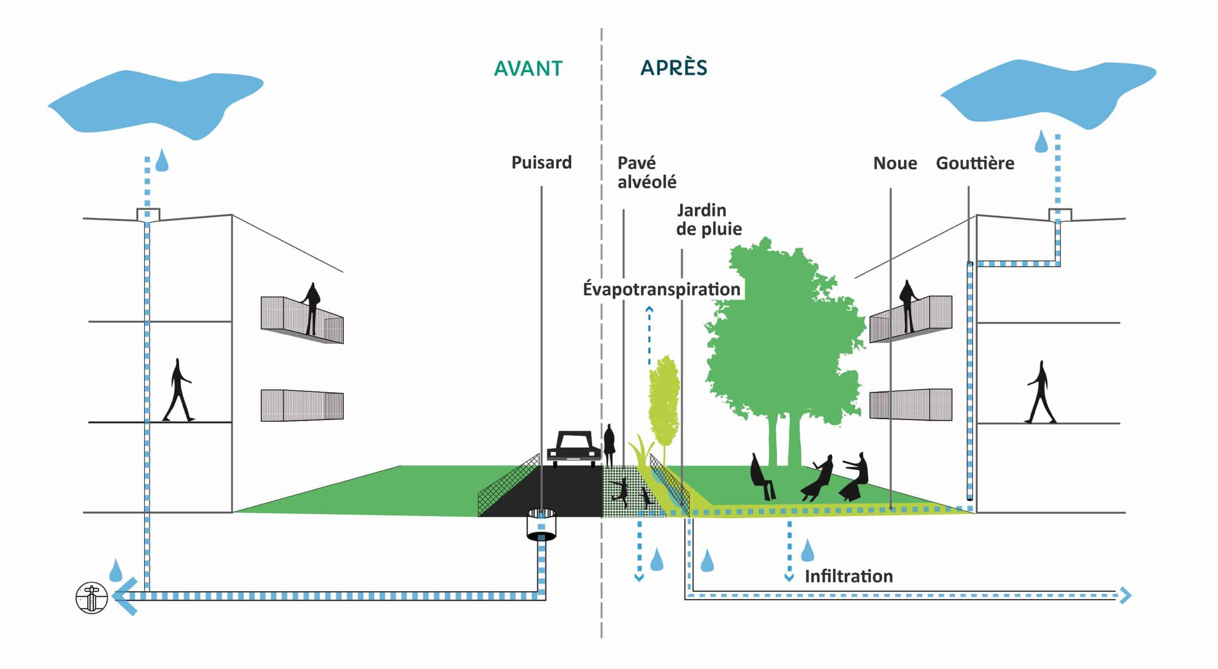 « Nos partenaires travaillent sur le choix de matériaux et d’éléments architecturaux qui mettront l’eau de pluie en valeur, ajoute Pascale Rouillé. Elle passera par exemple par un petit moulin avant d’arriver dans un jardin de pluie végétalisé. »