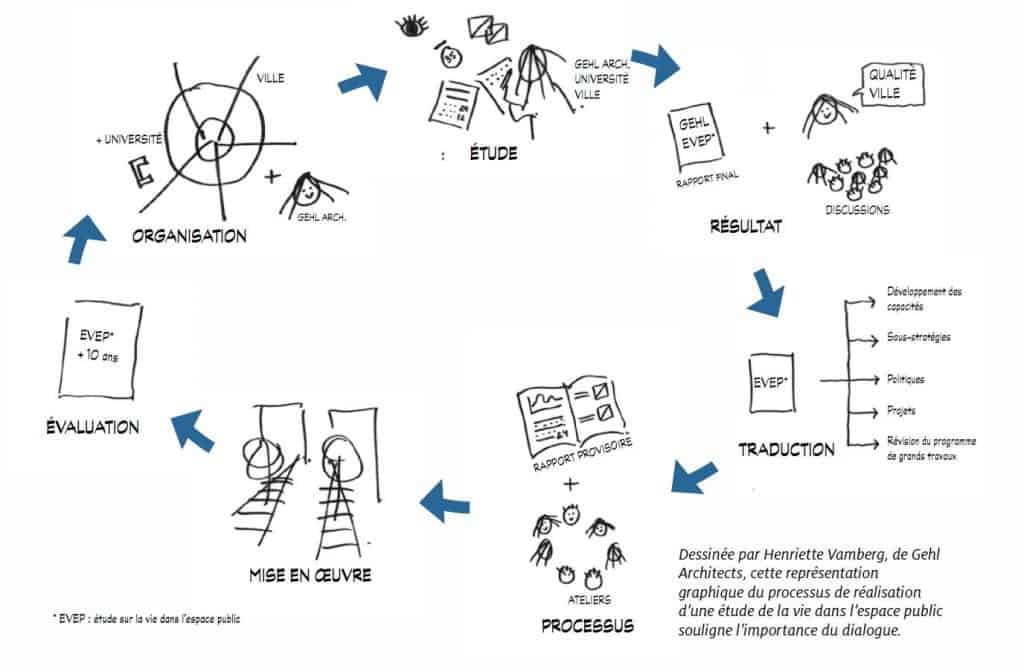 Processus de réalisation d’une étude de la vie dans l’espace public souligne l’importance du dialogue. Crédit image: Jan Gehl et Birgitte Svarre, La vie dans l’espace public. Comment l’étudier, Éditions Écosociété, 2019Les organisateurs communautaires et les professionnels de l’urbain trouveront ainsi dans ce livre une série d’exemples et d’outils gratuits à ajouter à leur répertoire. Plus qu’une invitation aux citoyens à observer individuellement la ville avec leurs chronomètres et calepins, il s’agit d’un rappel des leviers à notre disposition pour créer collectivement des villes conviviales, équitables et en santé.