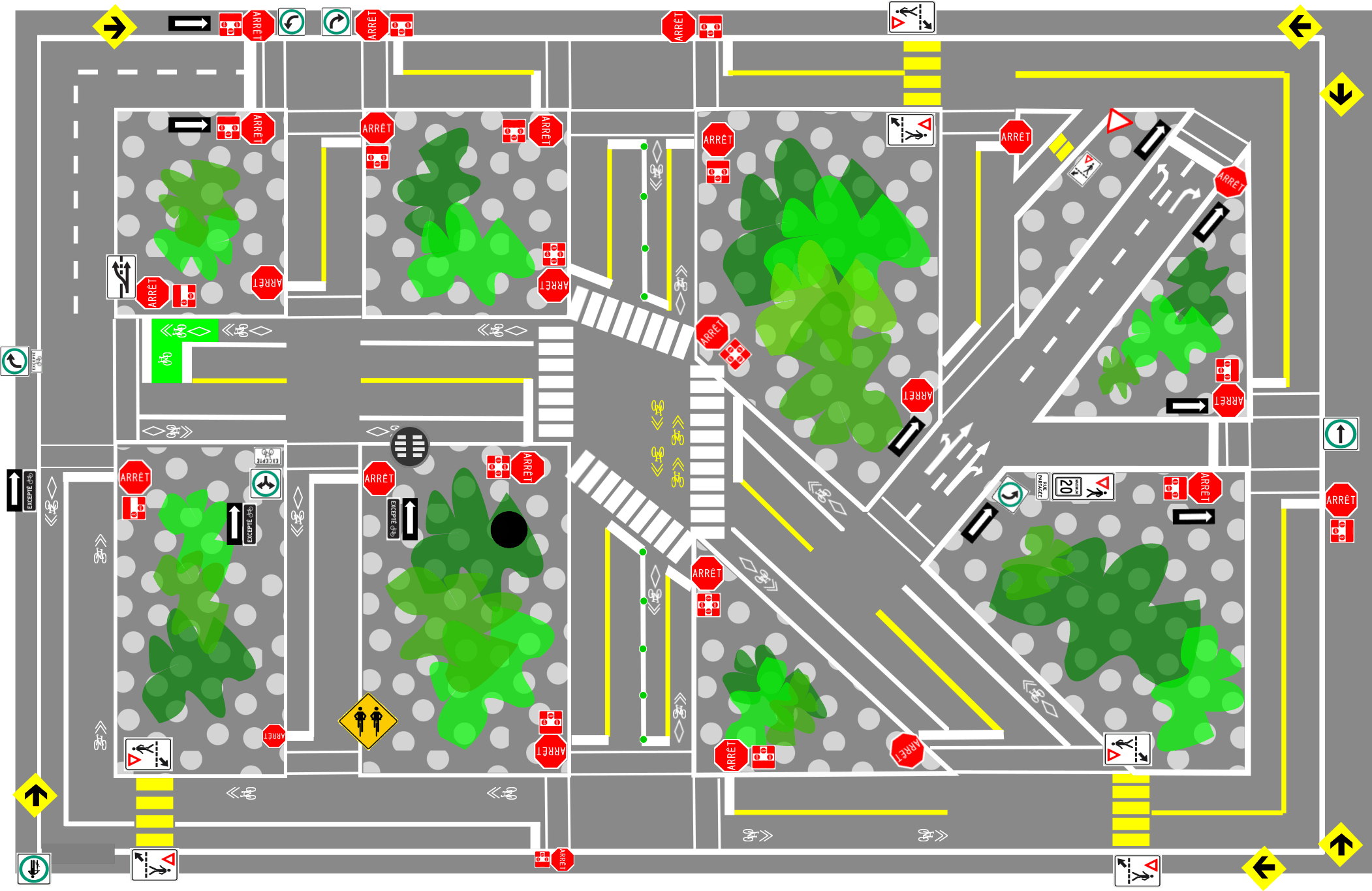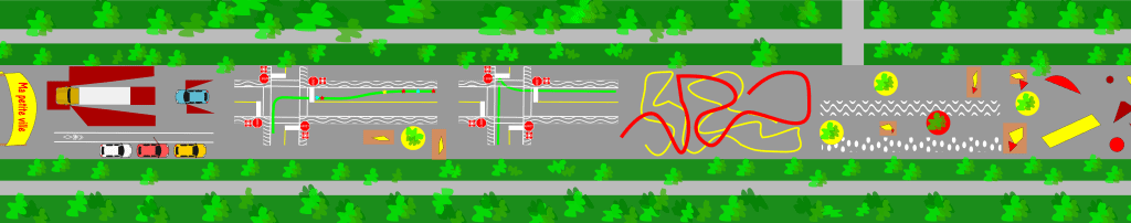 Rues pour les voitures, à sens unique ou à double sens; traverses piétonnes; voies cyclables bidirectionnelles, unidirectionnelles, à contre-sens de la circulation; intersections; panneaux de céder le passage, d’arrêt simple ou toutes directions; obligation de tourner à droite et même la nouvelle signalisation pour les rues partagées… voilà autant de cas de figure rassemblés dans un espace de 35 mètres par 55, sans oublier du verdissement pour agrémenter l’ensemble.