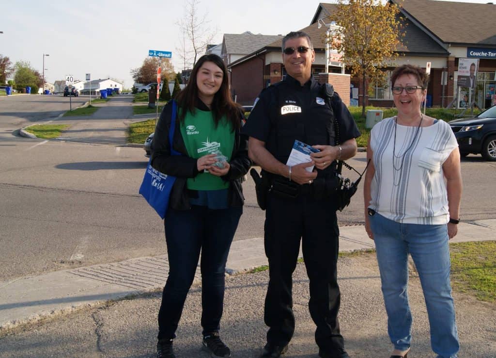 La responsable de la campagne, le service de police de la Ville et une membre du personnel de l’école se mobilisent à l’occasion du Défi Je suis capable ! pour féliciter les élèves arrivant en transport actif à l’école et pour sensibiliser les parents au syndrome de la porte (2017).Une action concertée