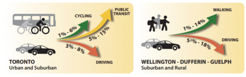 Les chercheurs ont utilisé des méthodes de calcul reconnues pour évaluer la valeur de ces changements d’habitudes. Ainsi, chaque véhicule-kilomètre parcouru en moins entraîne un bénéfice monétaire 0,79 $. Du côté de la marche, ils en ont évalué des bénéfices à 0,51 $ par kilomètre supplémentaire parcouru.