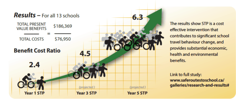 Pour chaque dollar investi dans la mise en place d’un programme de transport scolaire actif, une communauté récolte 2,4 $ après un an, selon une étude menée en Ontario. Mieux encore : après 5 ans, chaque dollar investi pourrait rapporter 6,3 $ !